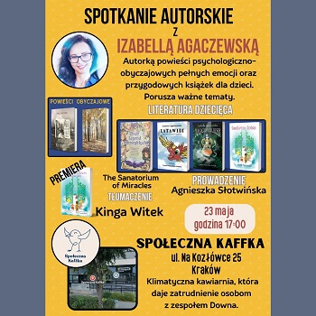 W maju miałam przyjemność spotkać się z przyjaciółmi i Czytelnikami na spotkaniu autorskim w Społecznej Kaffce. To wyjątkowe miejsce, gdzie zatrudnienie znajdują osoby z niepełnosprawnością intelektualną. Pyszne ciasta, wspaniała, uśmiechnięta obsługa. Spotkanie zbiegło się z premierą wersji dwujęzycznej Sanatorium Cudów. Tłumaczenia z języka angielskiego dokonała Kinga Witek.