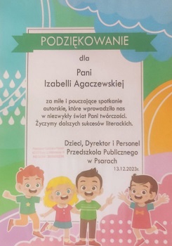 W grudniu po raz kolejny odwiedziłam Śląsk. Zostałam zaproszona do Zespołu Szkolno-Przedszkolnego nr 3 w Psarach. W grupie najmłodszych dzieci czytałam fragmenty książek, opowiadałam o historiach w nich zawartych. Był czas na pytania i na wspólną zabawę. Bohaterowie książki "Latawiec. Opowieść o niezwykłej przyjaźni" uwielbiali robić samoloty z papieru. Dlatego wraz z przedszkolakami składaliśmy samolociki i urządziliśmy prawdziwą bitwę powietrzną.